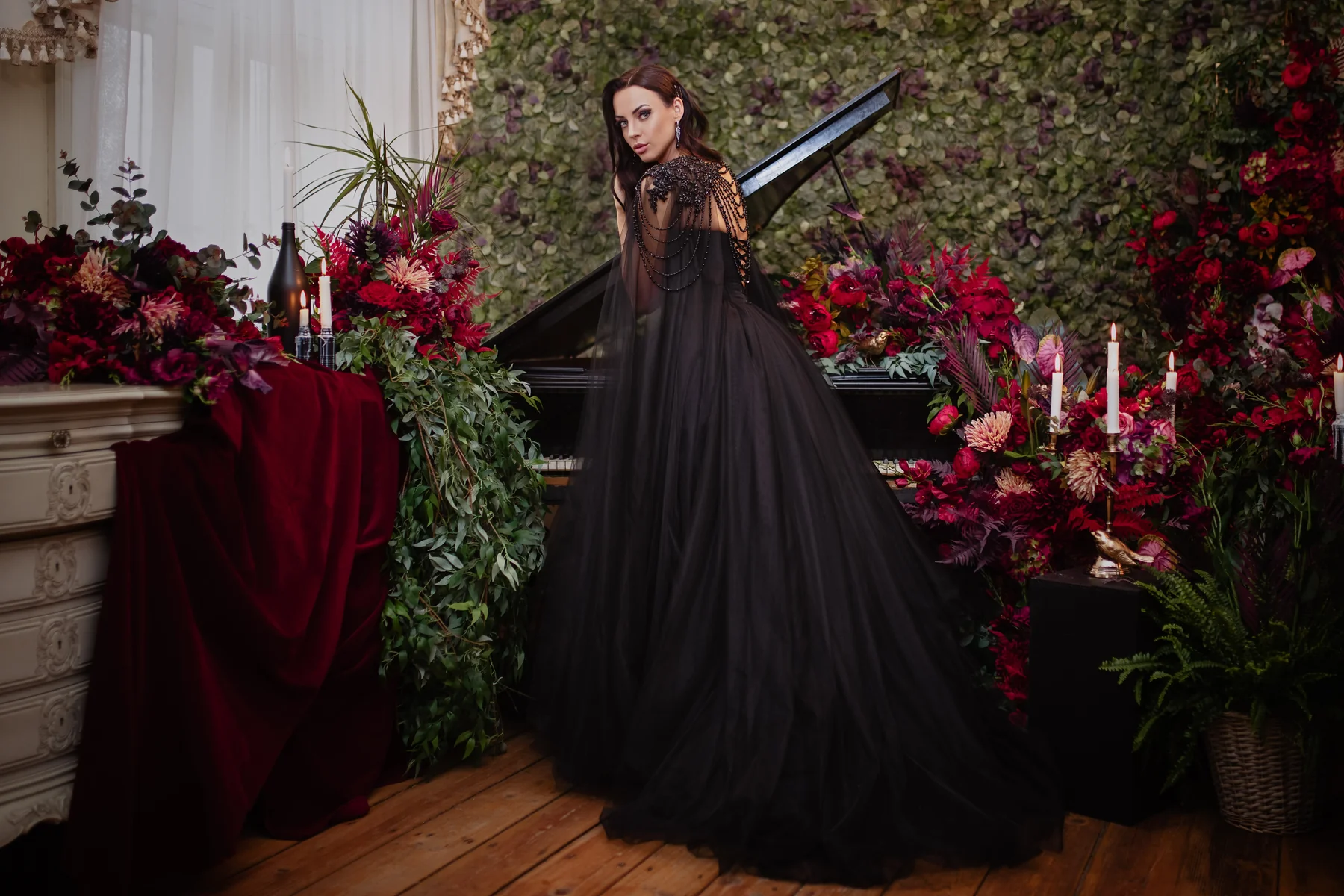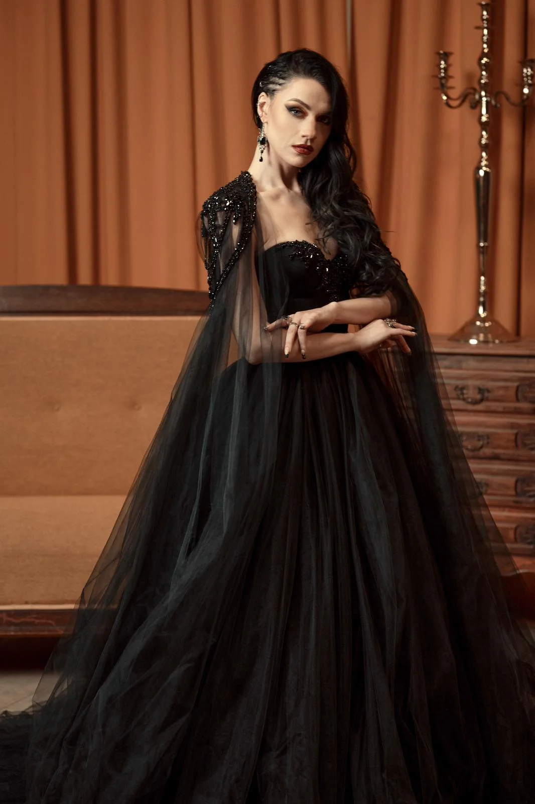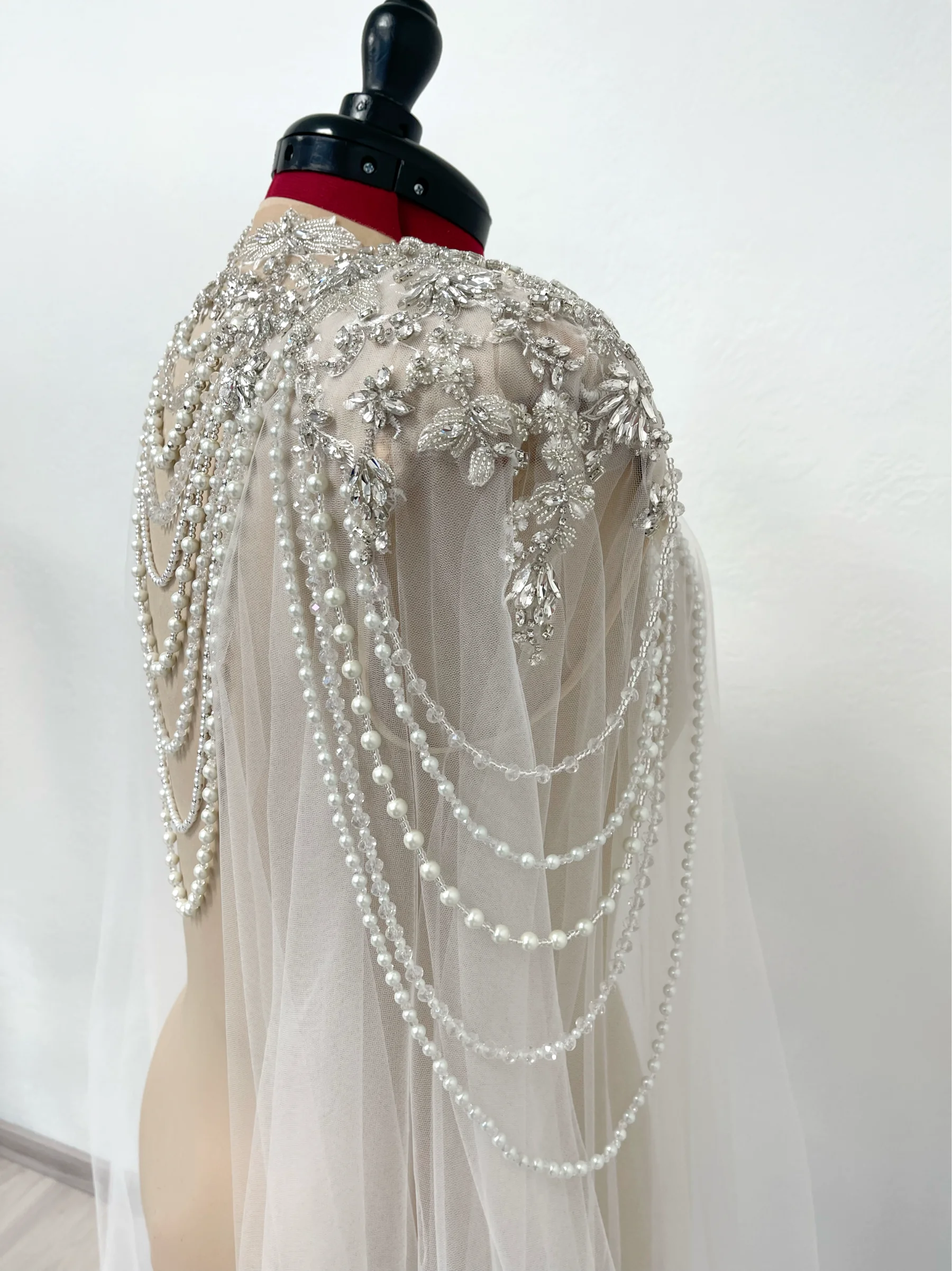 Choose from fingertip veils, cathedral-length capes, crystal-shouldered designs, or minimalist styles. Black tulle creates dramatic contrast, while ivory and champagne options offer quiet sophistication. These accessories are sold separately, so you can pair them with your gown exactly as you wish. Everything is hand-sewn in our atelier—no generic trims, no mass production.