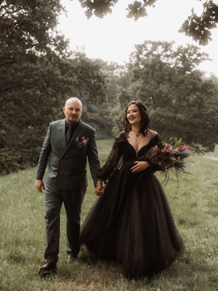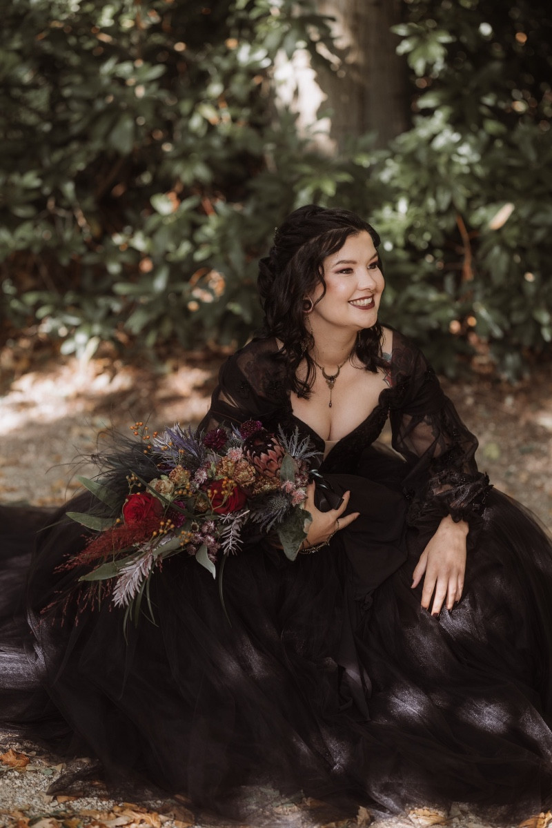 Black Vintage style basque style corset wedding dress. The corset has boning, bra padding and lacing. The bodice is decorated with floral lace appliqués, shoulders and detachable puffy sleeves are decorated with 3D Florals. The skirt is made of many layers of black soft tulle and has a 1 meter train.