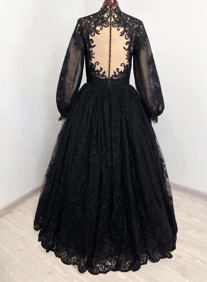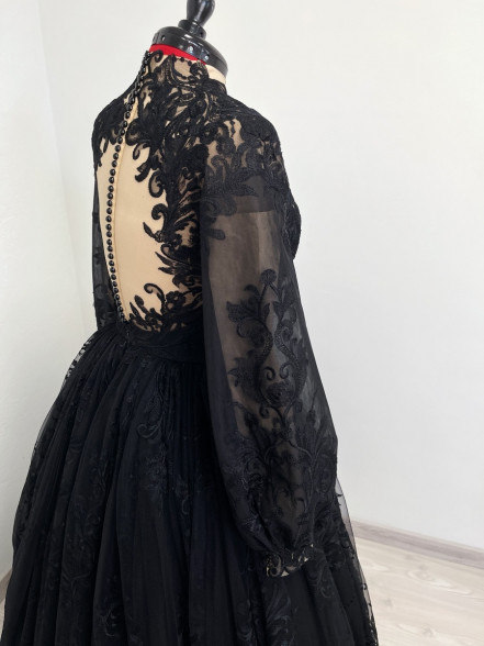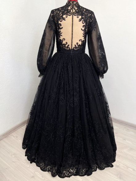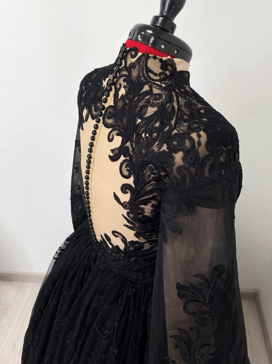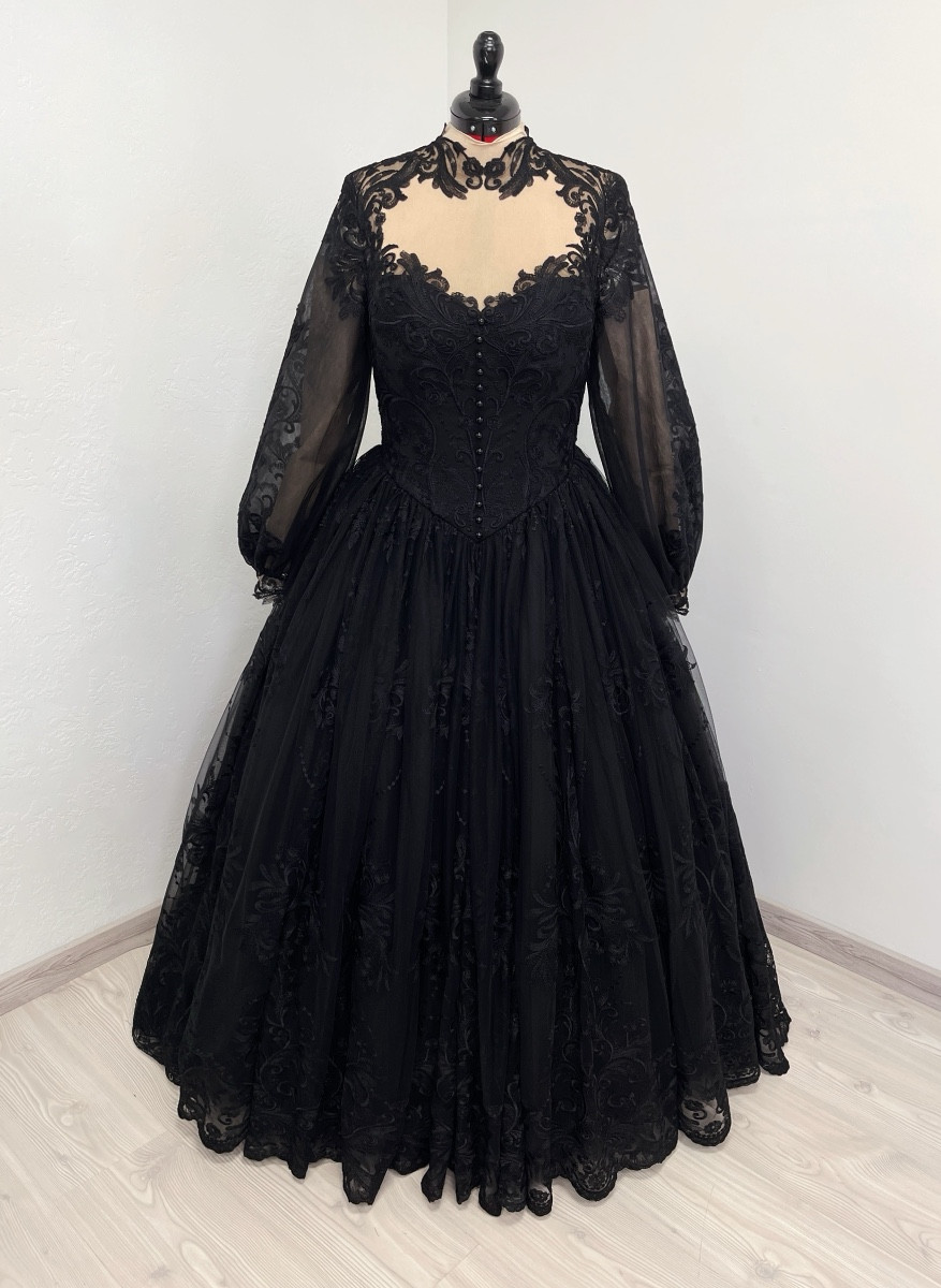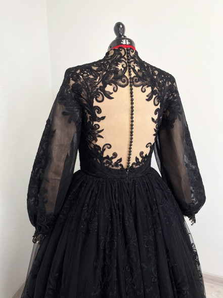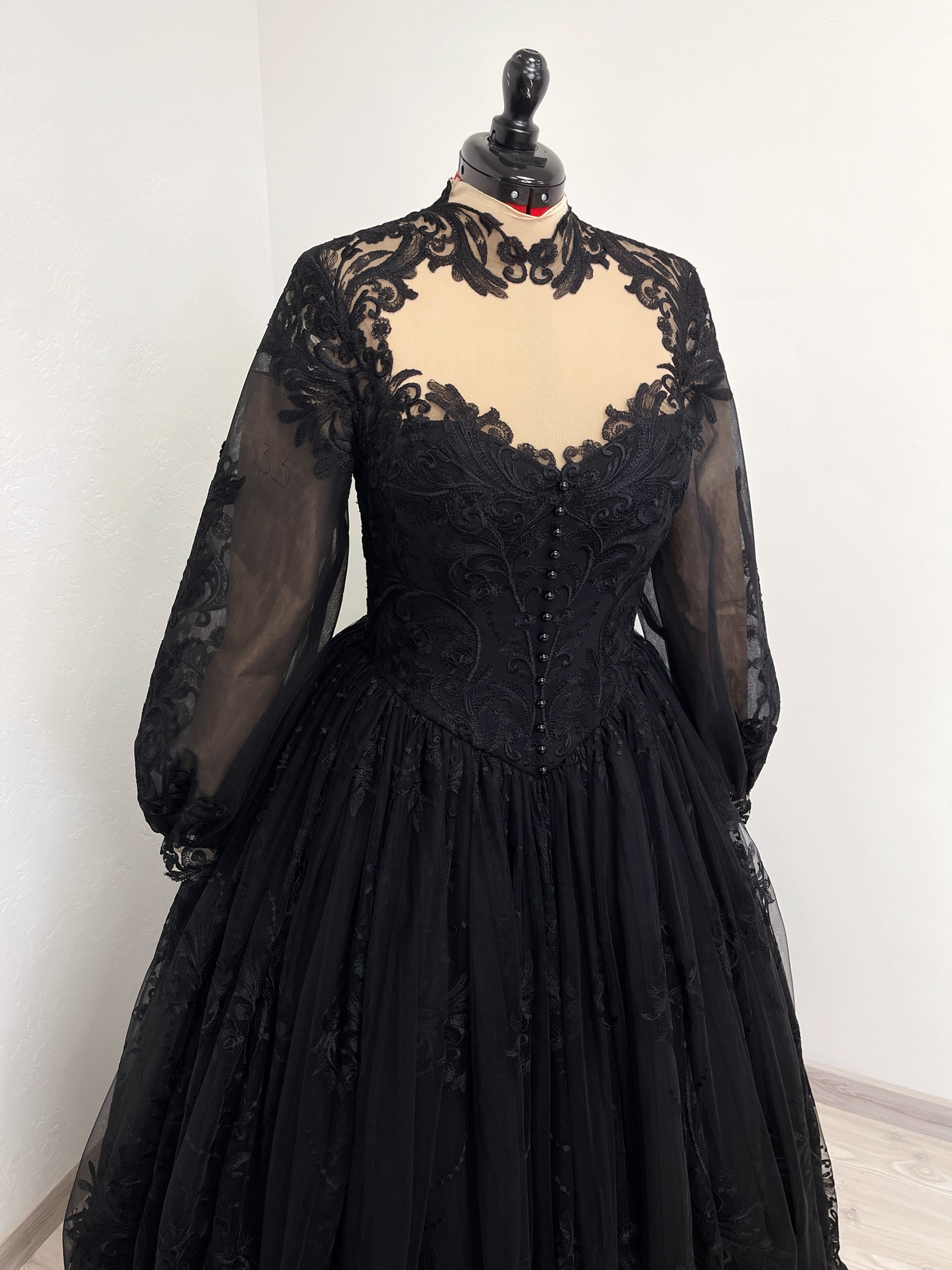 Black basque waist line corset wedding dress with off the shoulder bishop sleeves. The corset has boning, bra padding. Illusion/nude mesh back with many black little buttons and loops. Sleeves have matching ace cuffs with buttons.