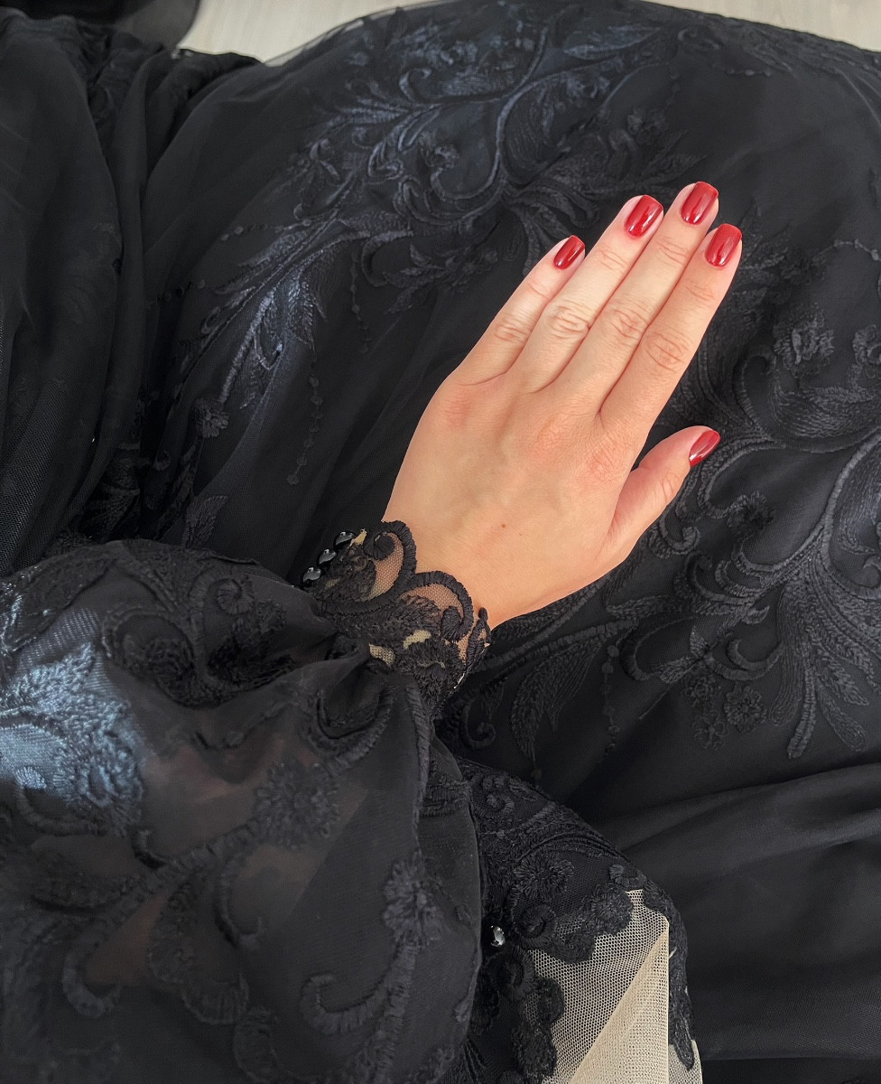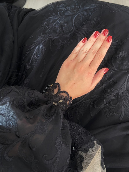 Skirt is made of many layers of black soft tulle and the top layer is black lace with a scalloped hem. The skirt back length is few inches longer than the front.