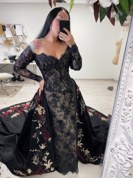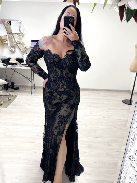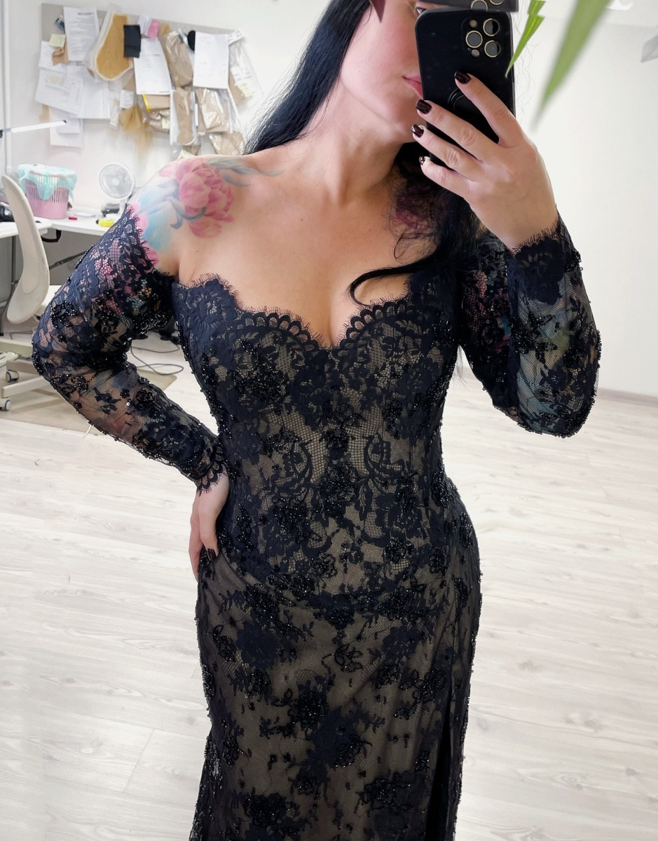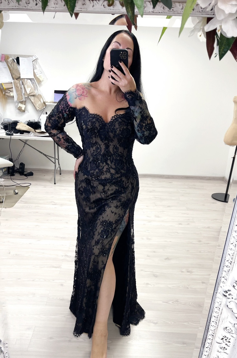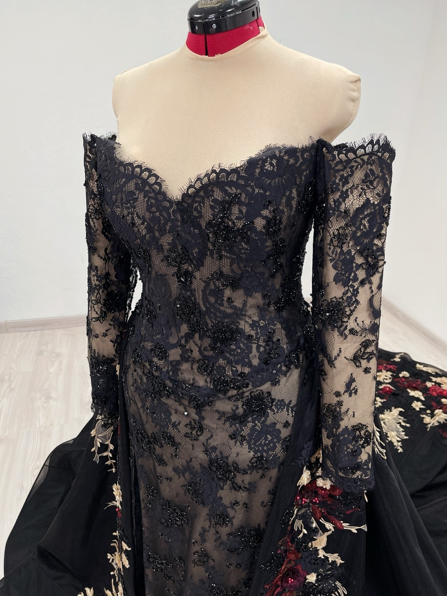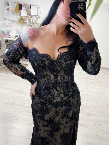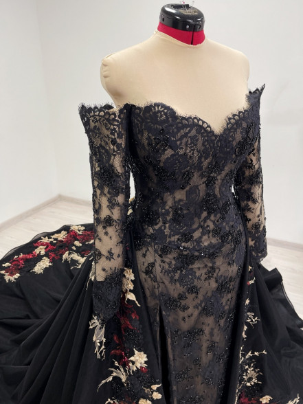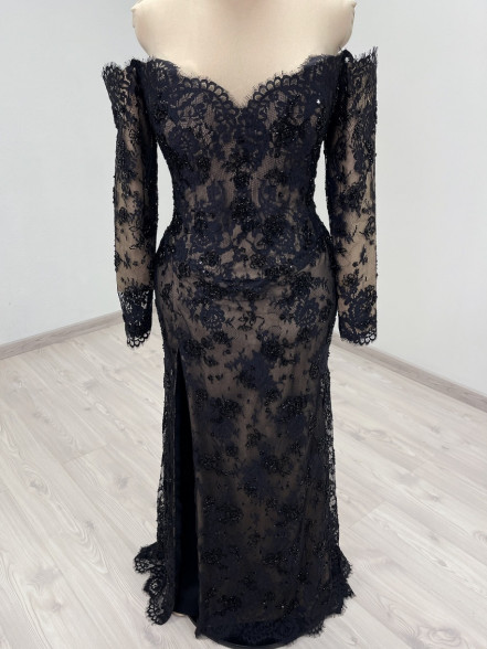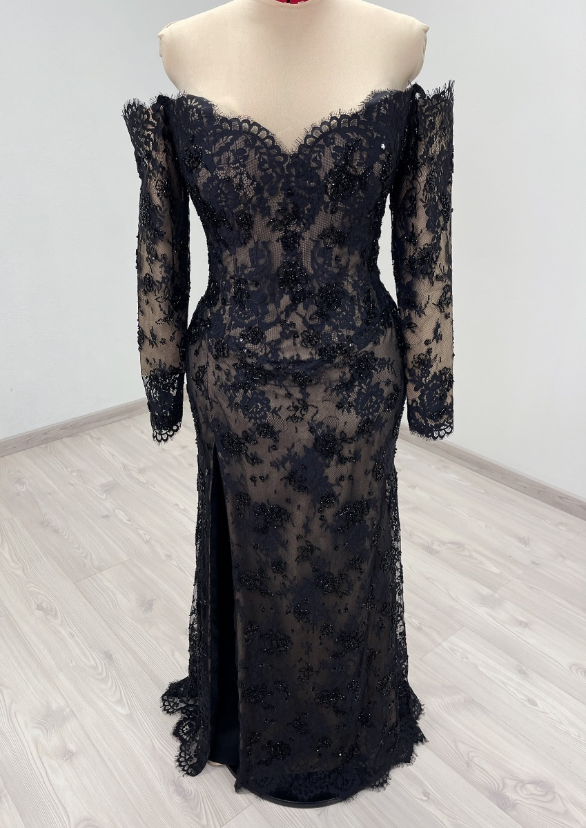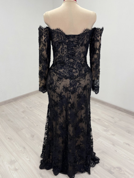 Off the shoulder black and beige beaded lace corset dress with slim fitted sleeves, basque waistline and leg slit. The corset has boning, bra padding, eyelet lacing, detachable back panel.