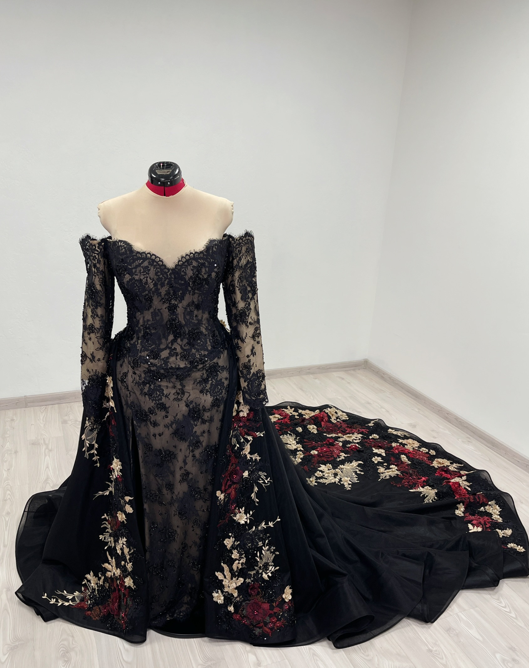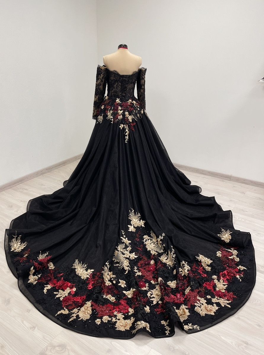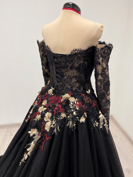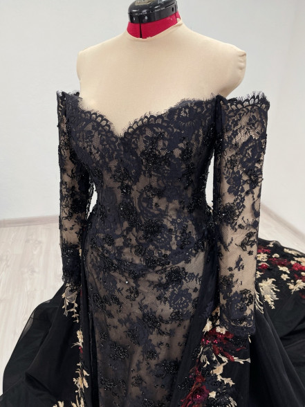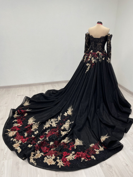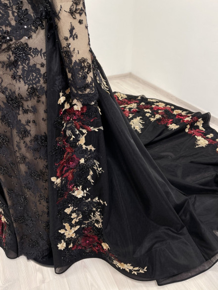 Detachable black tulle skirt with a 1 meter /40 inch long train is decorated with red, burgundy, gold and black beaded appliques.