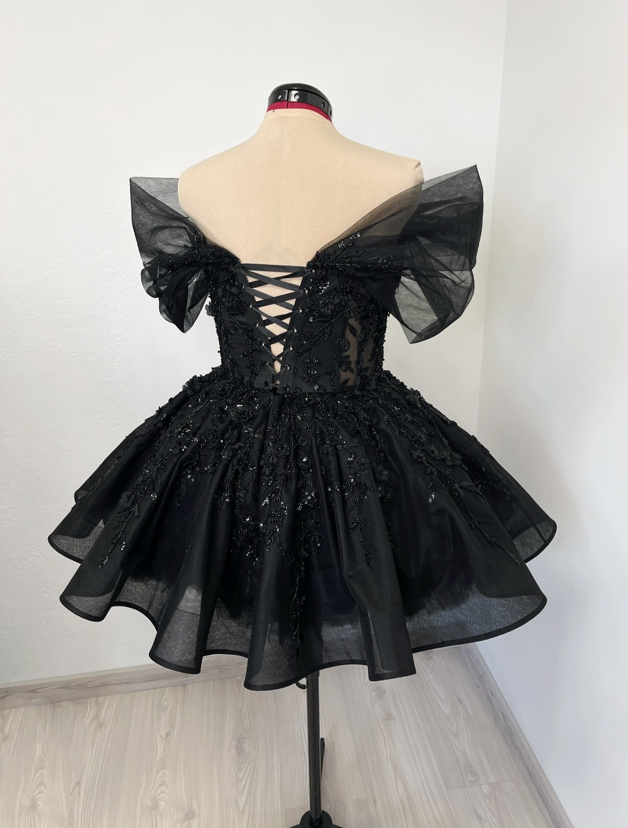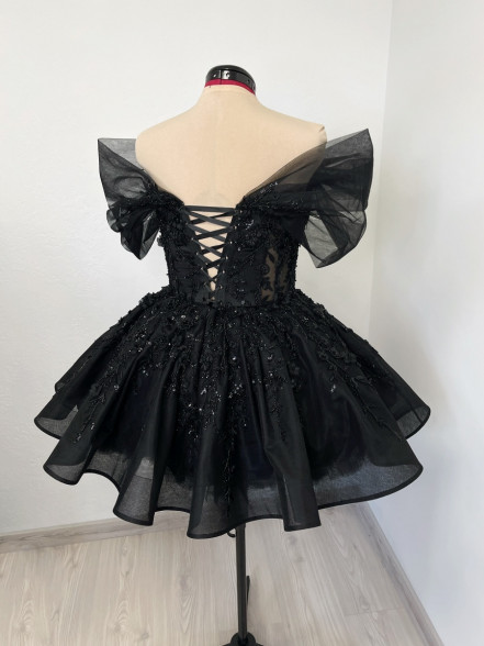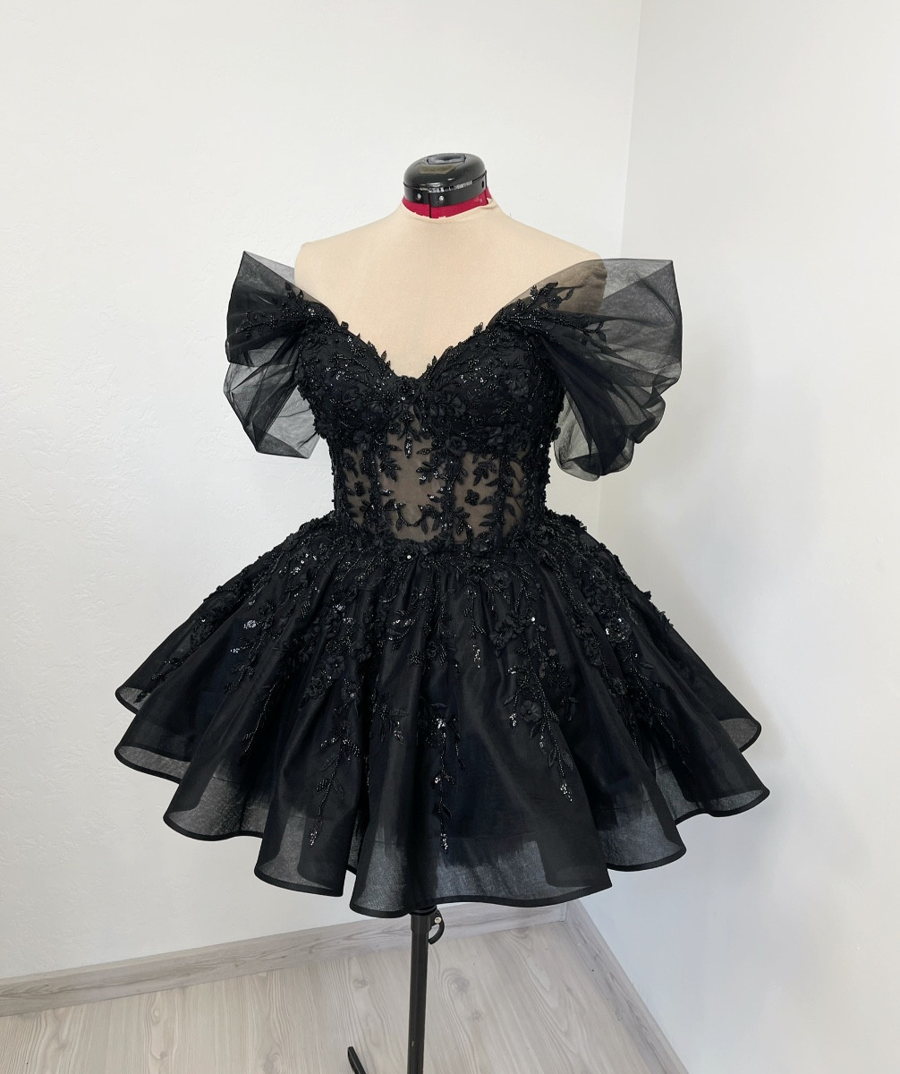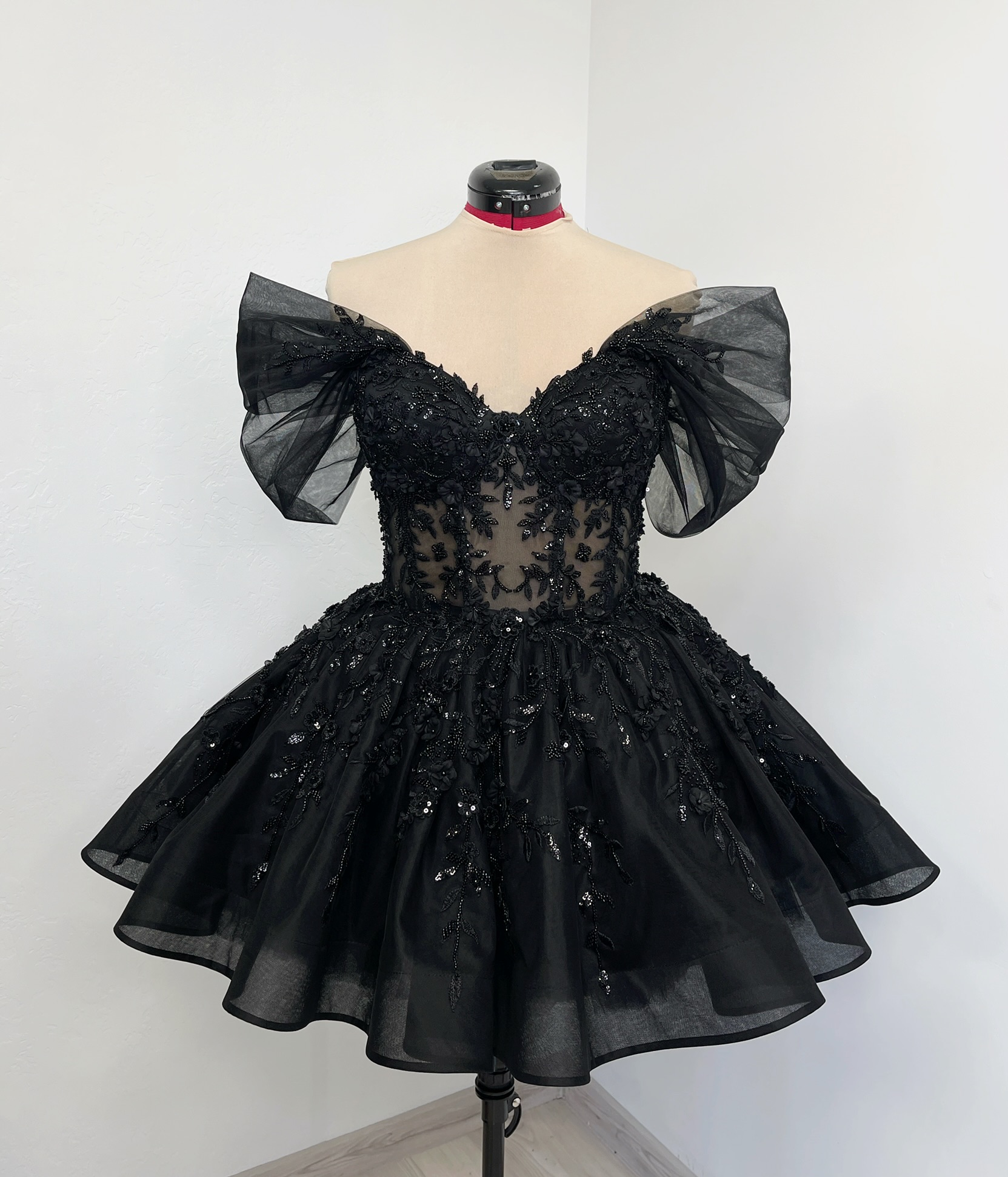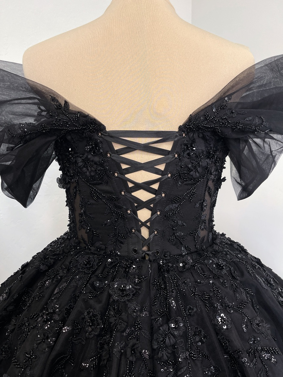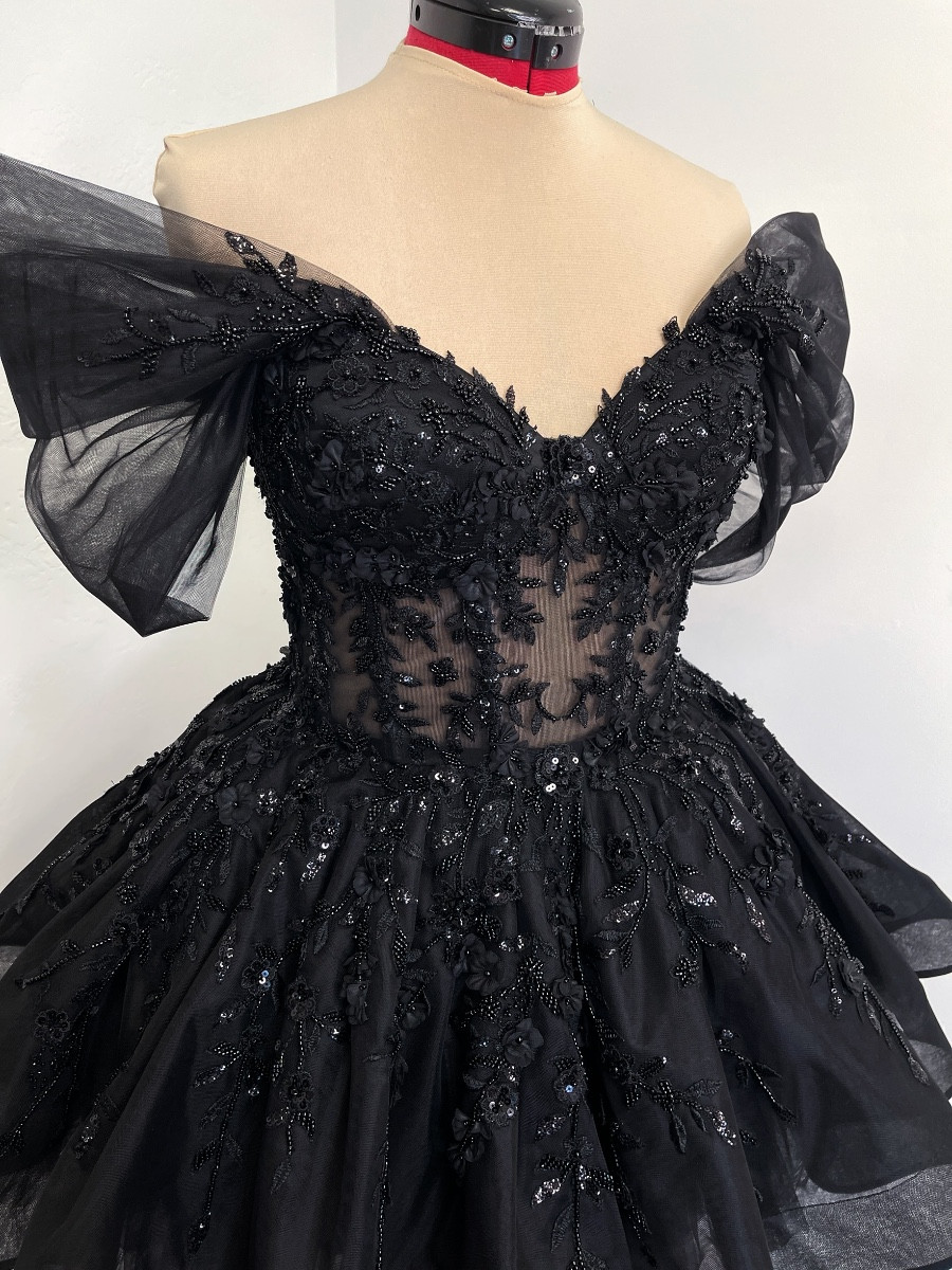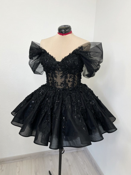 The see through/sheer corset has boning, bra cups and lacing. Bodice and skirt decorated with 3D floral lace appliques. Skirt length is 41 centimeters ( 17 inches )