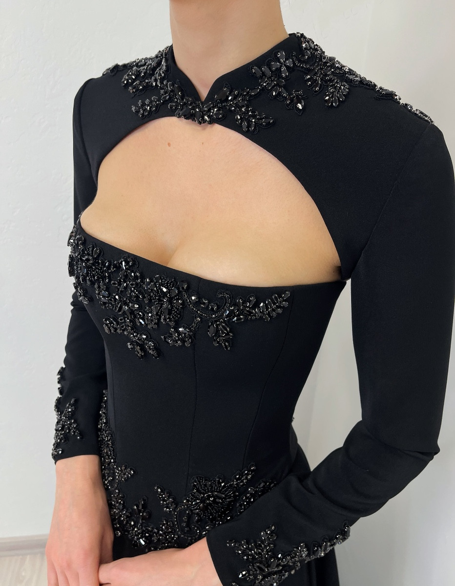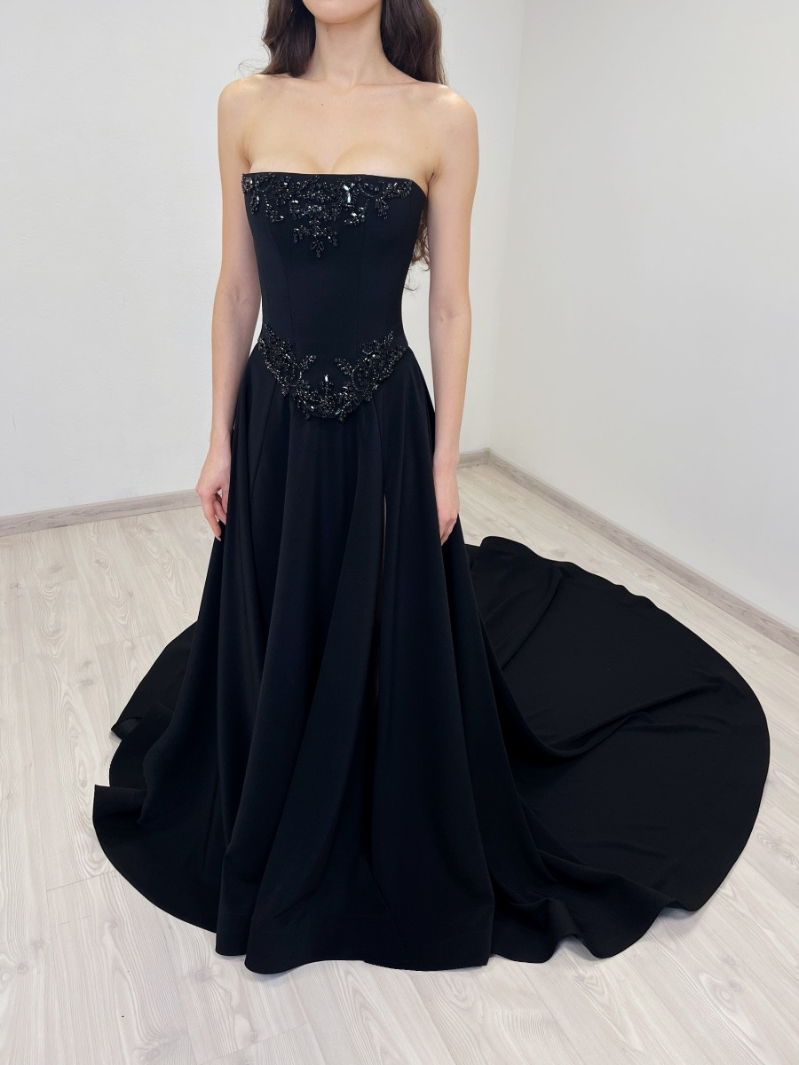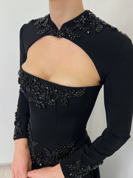 Black corset with boning, bra padding, eyelets and removable back panel. The corset is decorated with black crystal appliques.