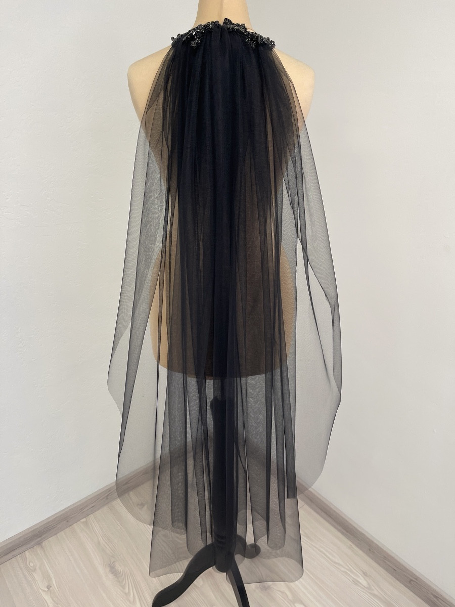 Black fingertip - 1 meter ( 39 inches ) long veil made of soft tulle. The veil comes with a hair comb decorated with black crystals.