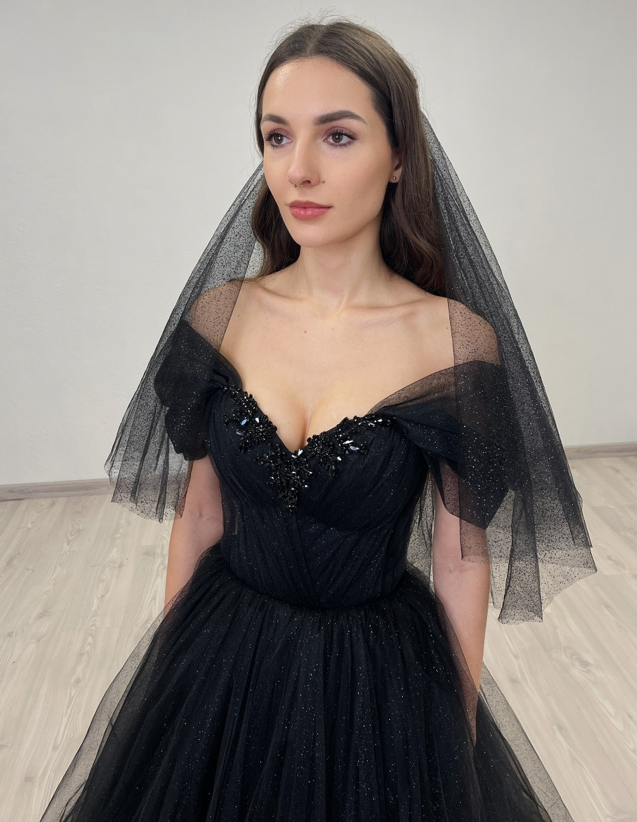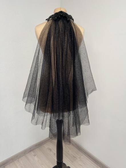 Black fingertip - 1 meter ( 39 inches ) long veil made of soft glitter sparkly tulle. The veil comes with a hair comb decorated with black crystals.