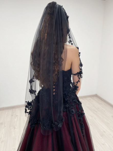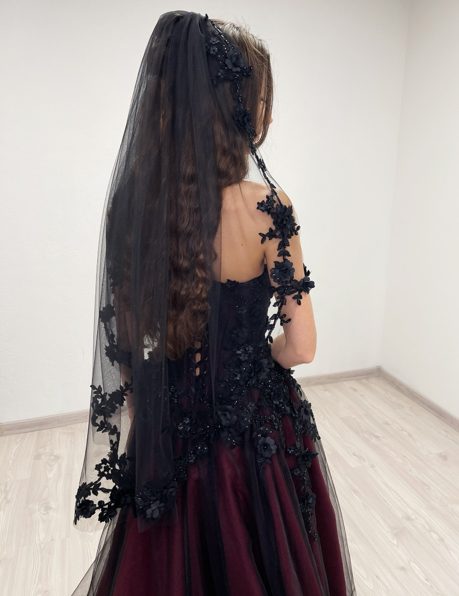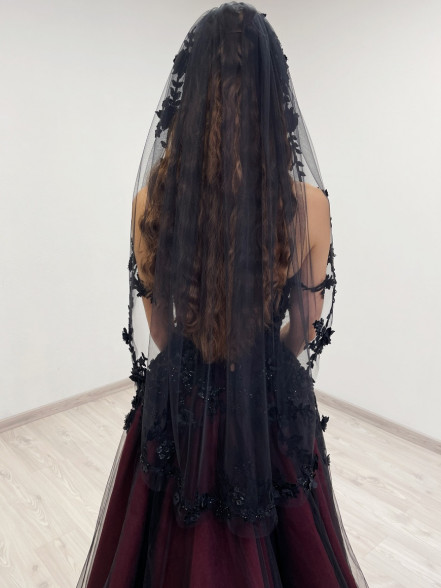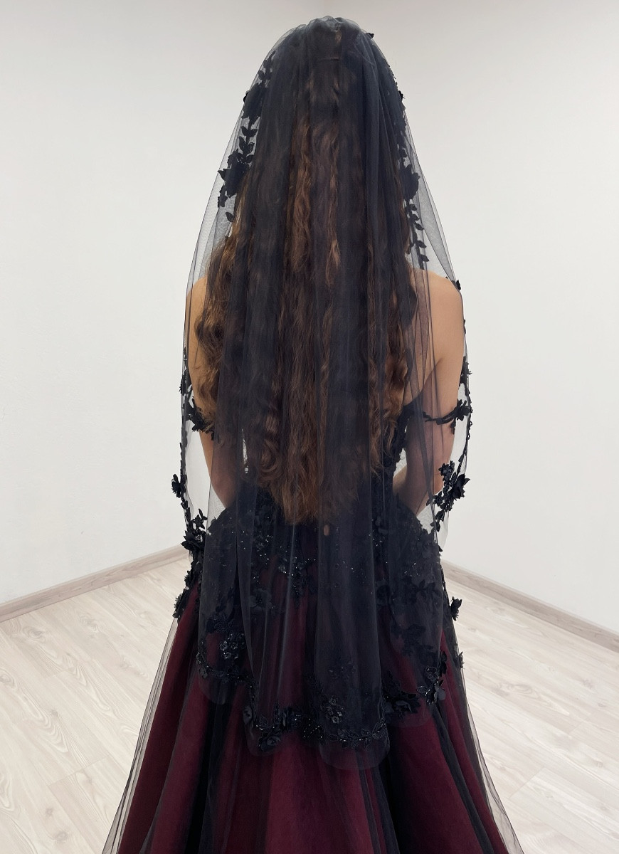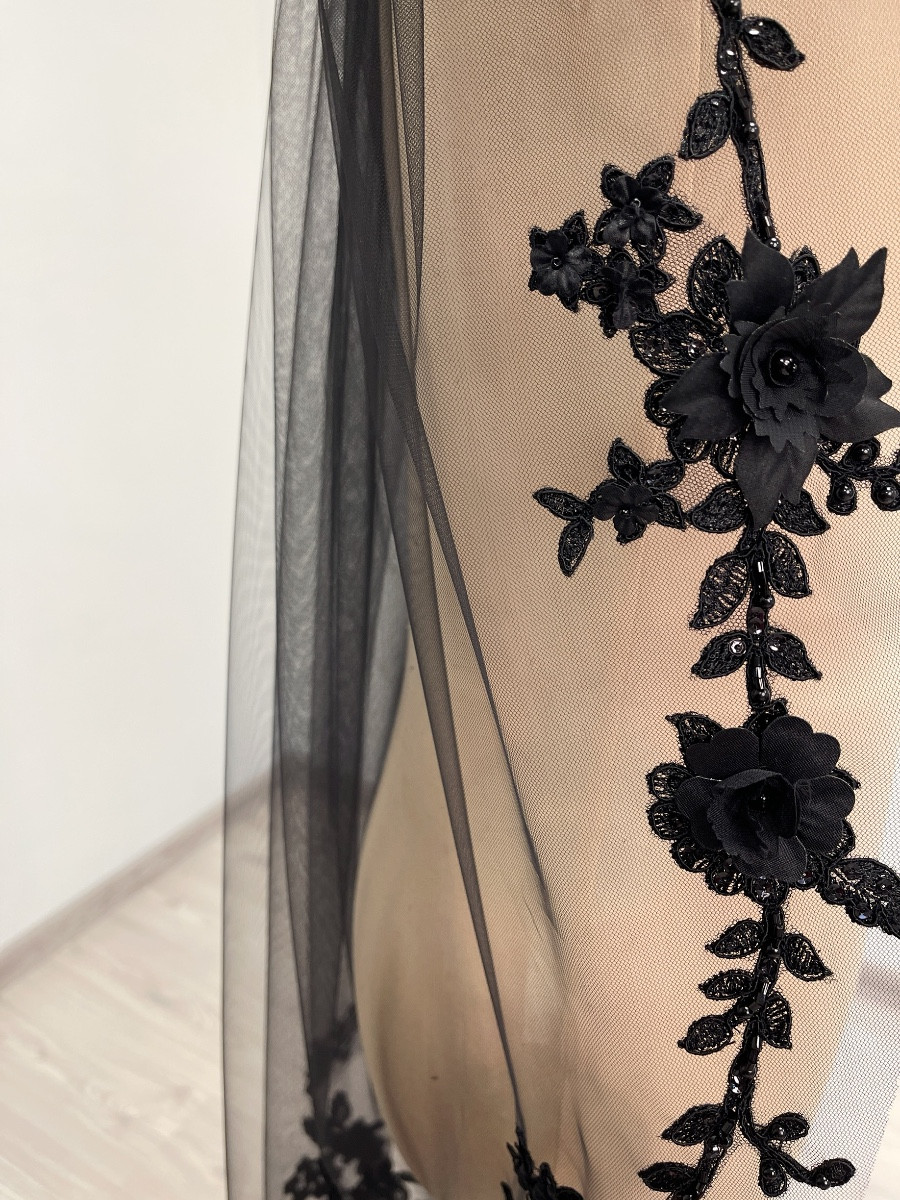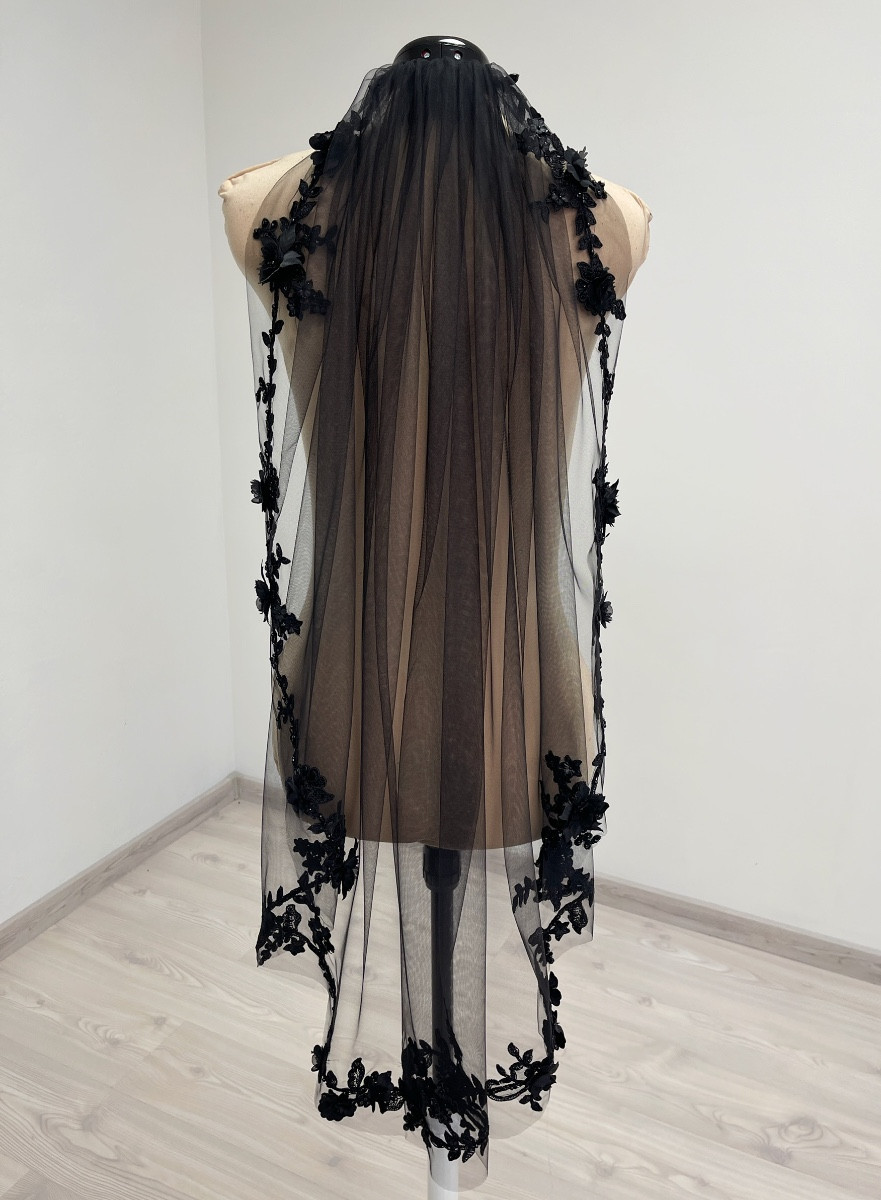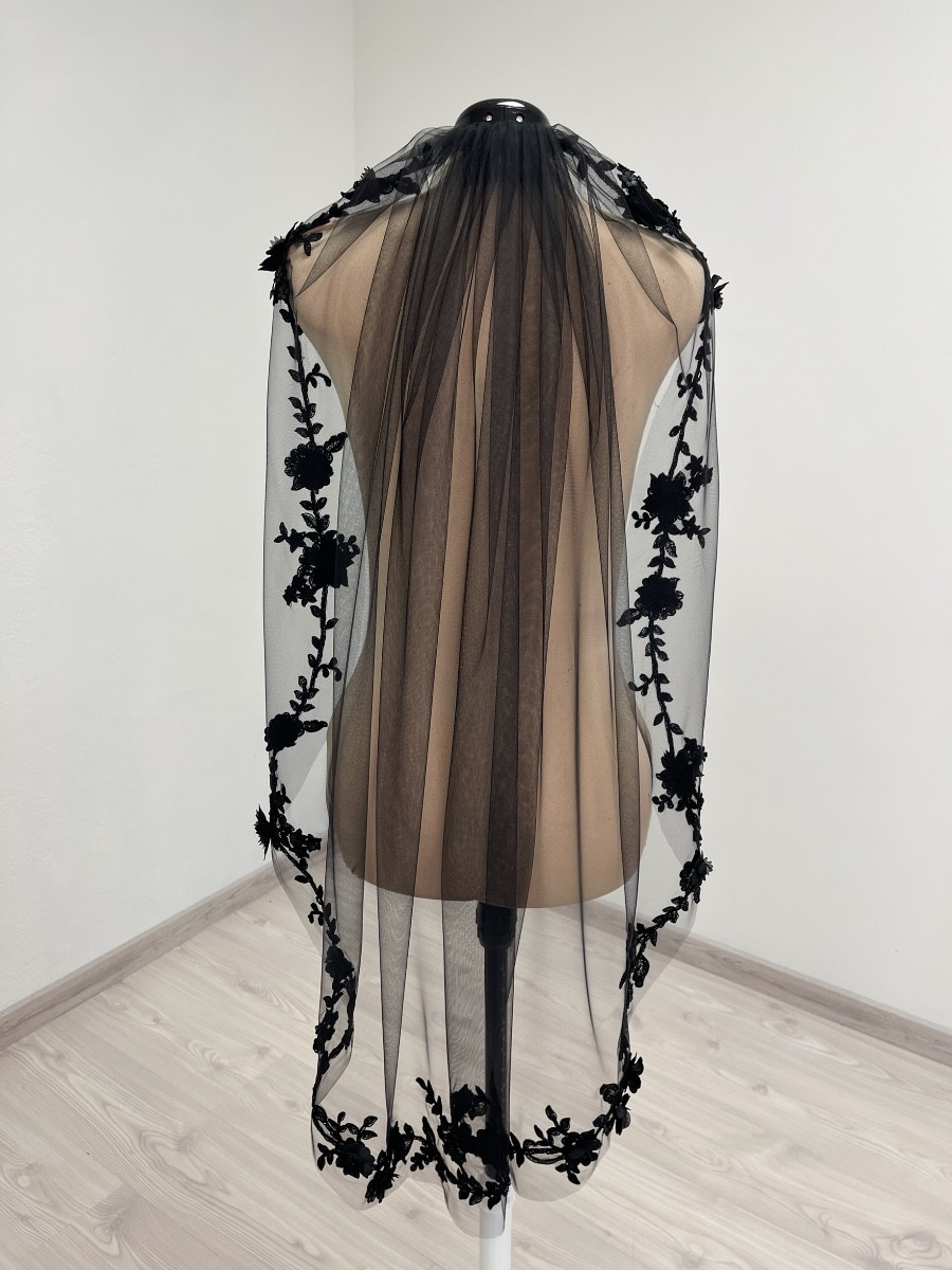 Black fingertip length ( 1 meter / 39 inches ) veil. Decorated with floral beaded trim appliques. The veil comes with a hair comb.
