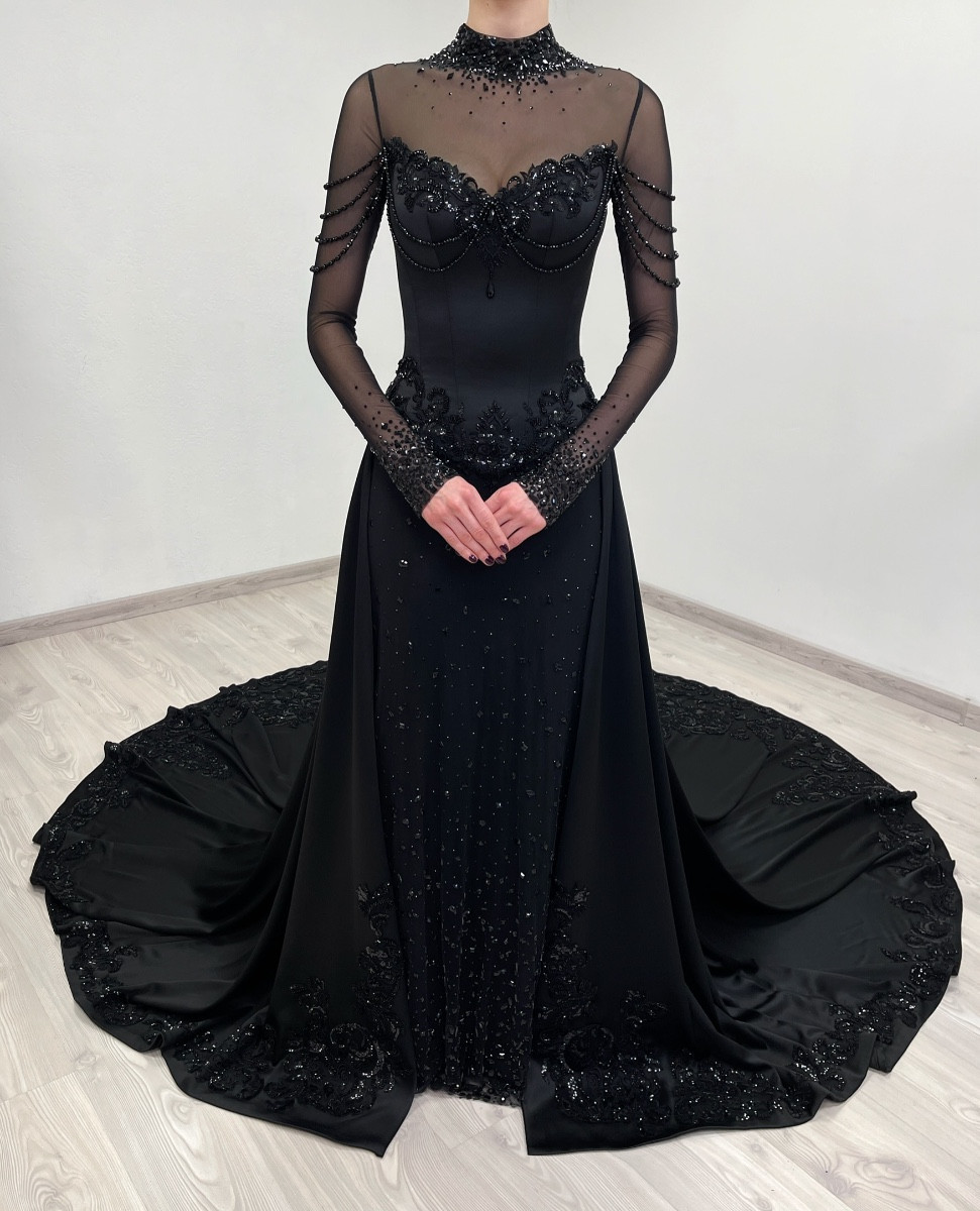*black sheer mesh bodysuit decorated with crystals on the neckline and sleeves.
