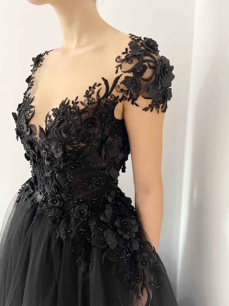 Bodice made of nude and black mesh, decorated with 3D beaded floral lace appliqués. The skirt consists of lining, 5 layers of soft black tulle and a hidden zipper closure.