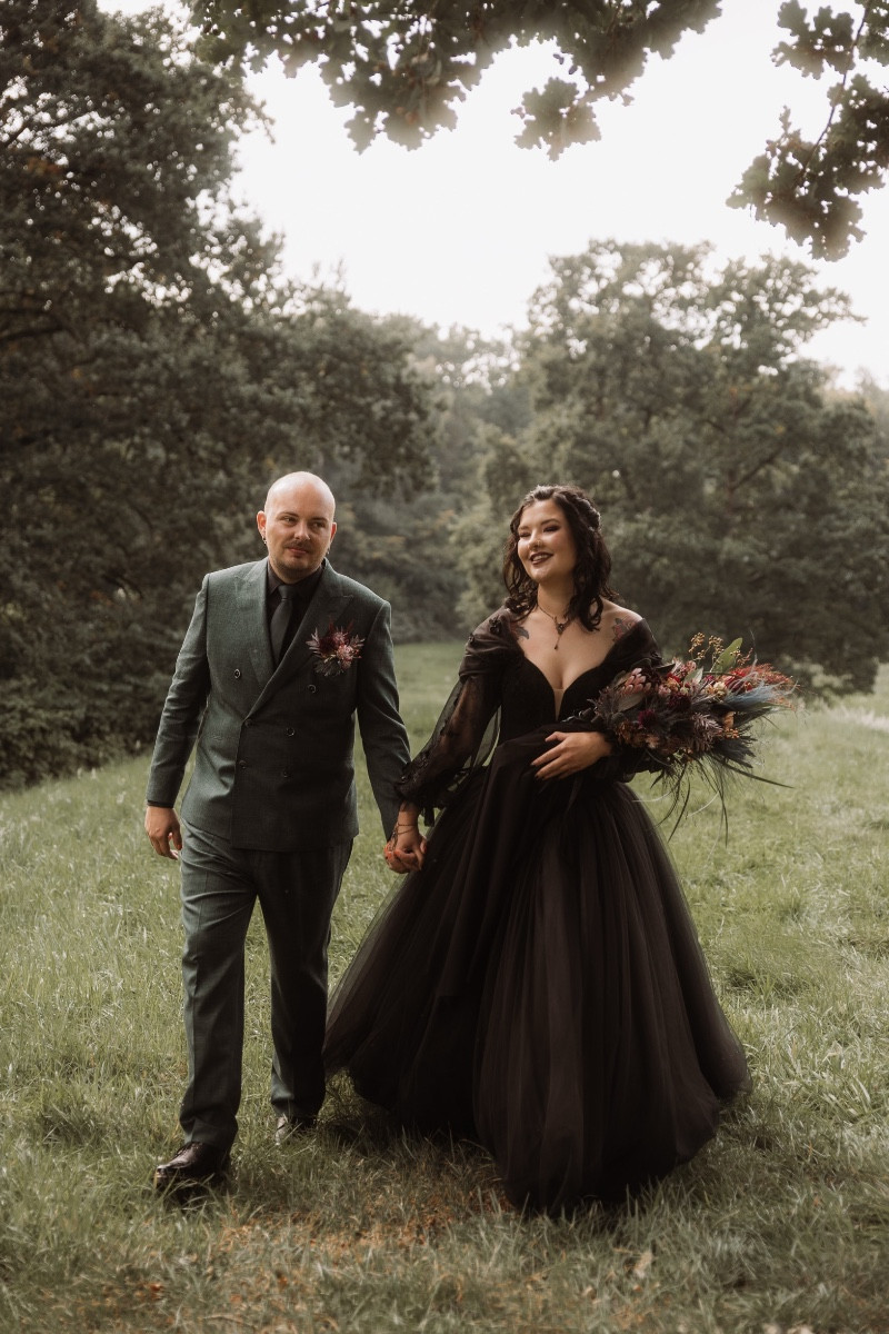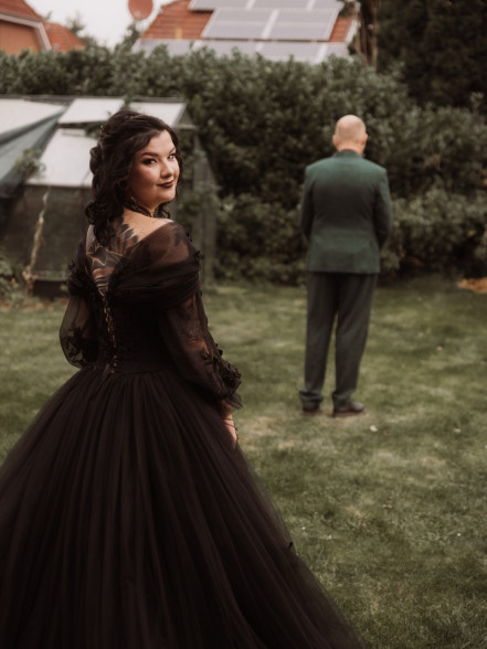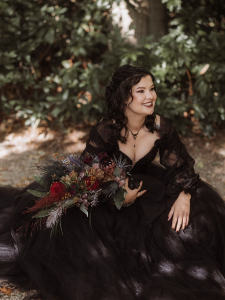 Black Vintage style basque style corset wedding dress. The corset has boning, bra padding and lacing. The bodice is decorated with floral lace appliqués, shoulders and detachable puffy sleeves are decorated with 3D Florals. The skirt is made of many layers of black soft tulle and has a 1 meter train.