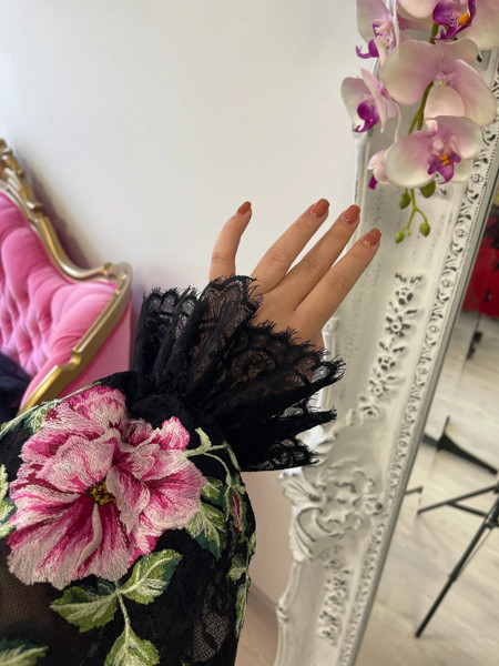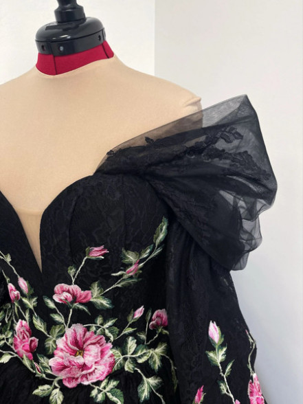 Black corset wedding gown;. The bodice, sleeves and skirt are made up of soft black lace. The skirt is made with many layers of soft black tulle for volume and the top layer is made of black lace. Shoulders are made of tulle and decorated with lace appliqués to match the dress. The puffy tulle and lace sleeves are decorated with the same pink flowers as the bodice. The sleeves are detachable. The corset has boning, lacing and soft bra pads.