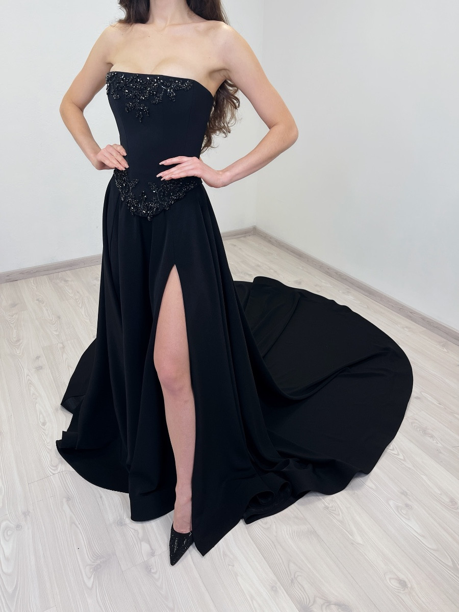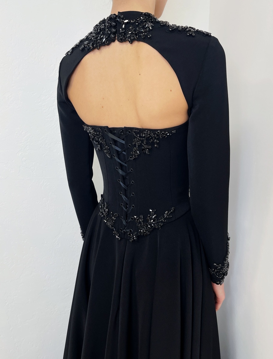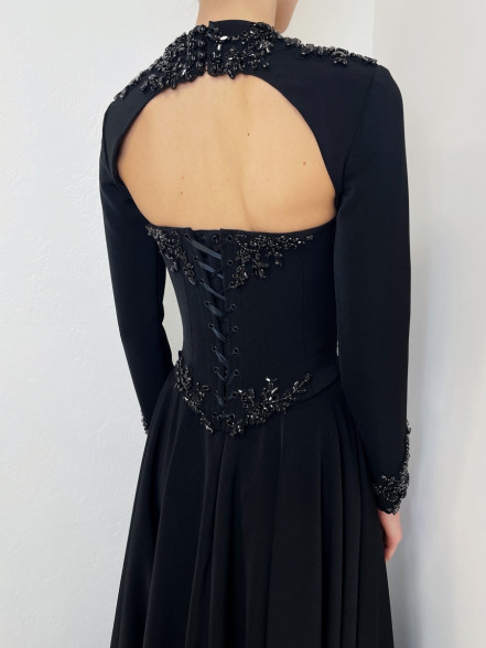 Black corset with boning, bra padding, eyelets and removable back panel. The corset is decorated with black crystal appliques.