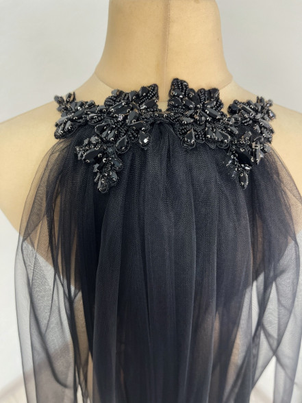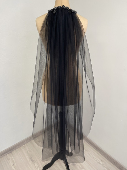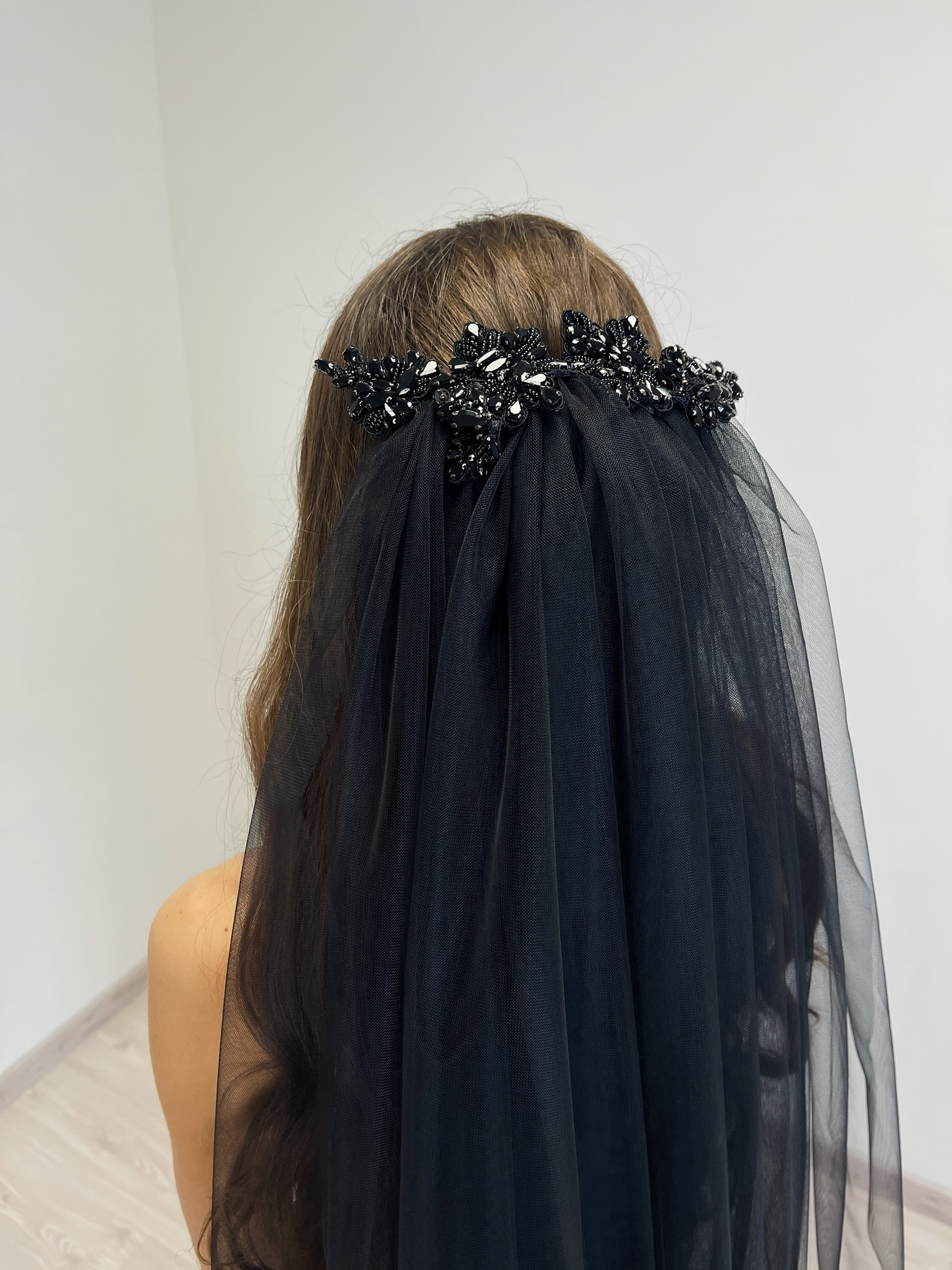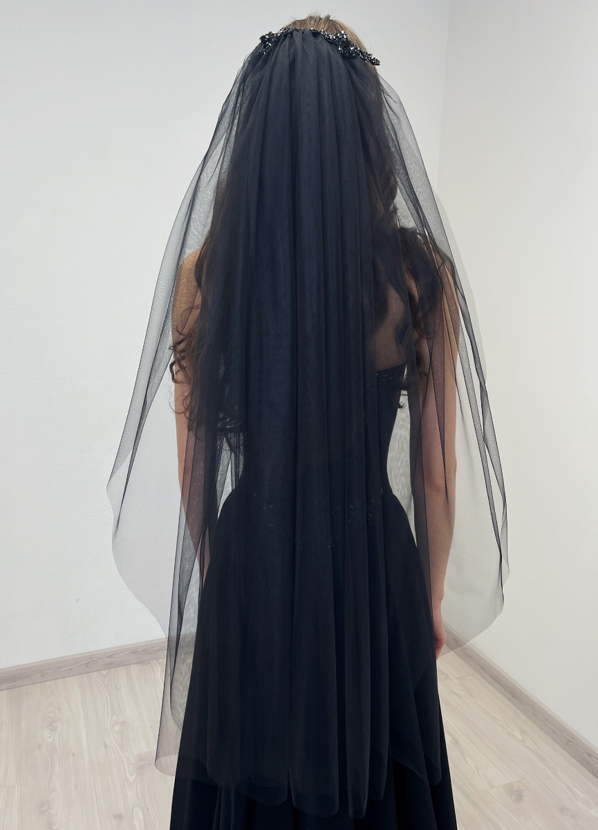 Black fingertip - 1 meter ( 39 inches ) long veil made of soft tulle. The veil comes with a hair comb decorated with black crystals.