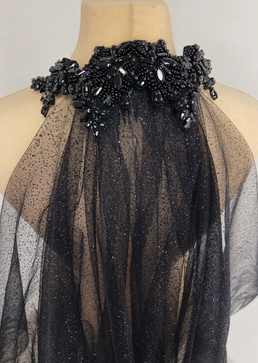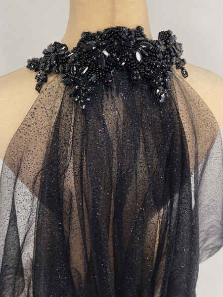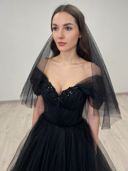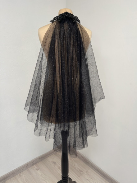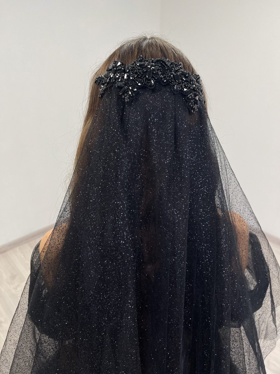 Black fingertip - 1 meter ( 39 inches ) long veil made of soft glitter sparkly tulle. The veil comes with a hair comb decorated with black crystals.