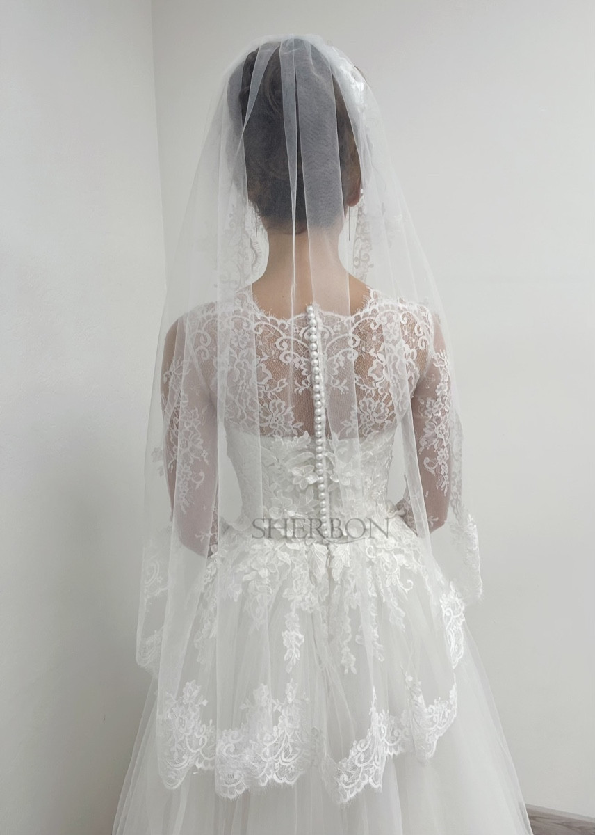 White (ivory) tulle veil with a scalloped lace trim. Length - 95 centimeters.