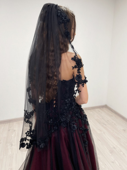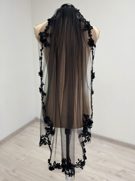 Black fingertip length ( 1 meter / 39 inches ) veil. Decorated with floral beaded trim appliques. The veil comes with a hair comb.
